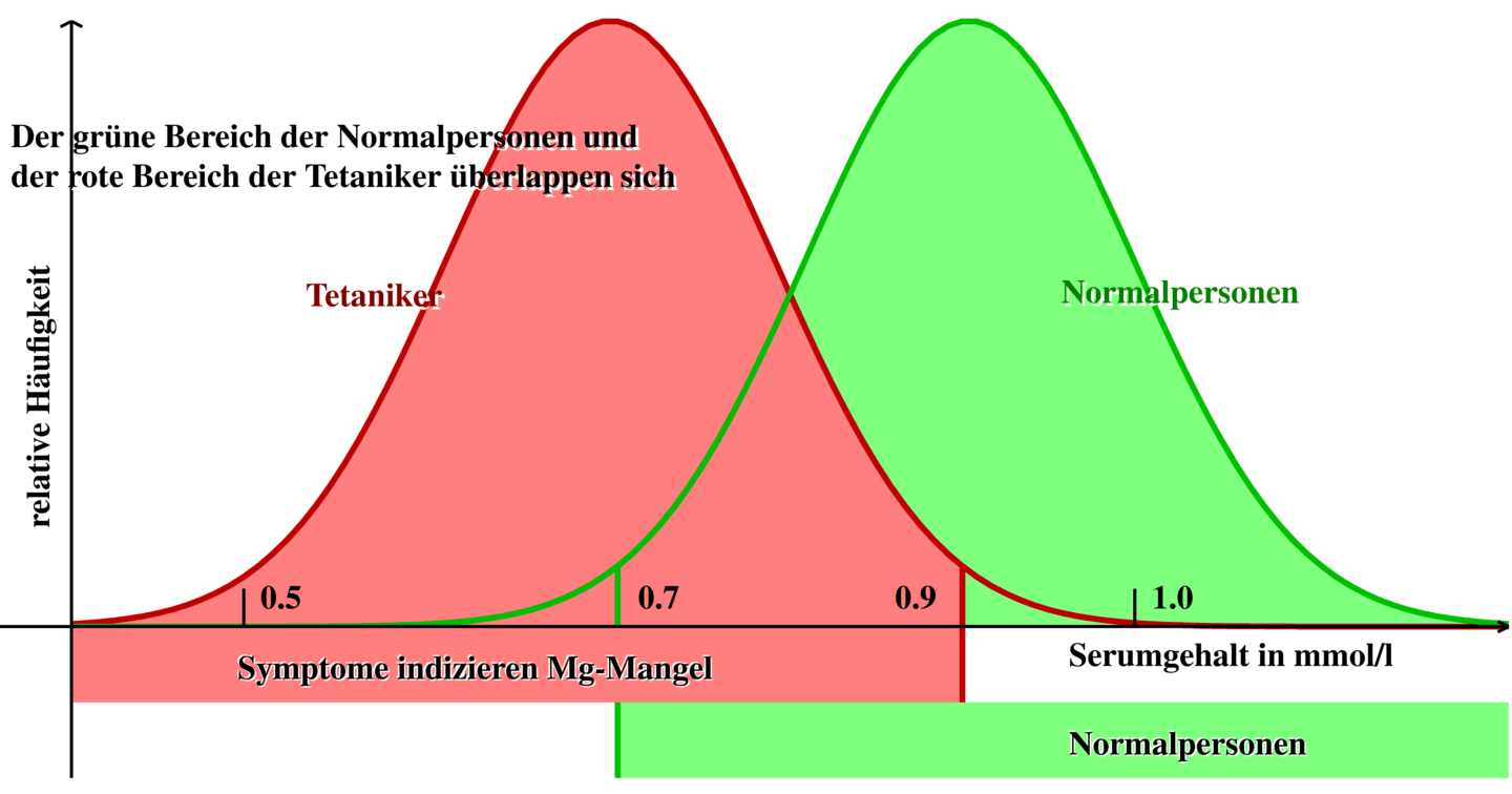 3. Der Serumwert wird nur selten bestimmt und dann auch meist fehlinterpretiert, da die Referenzbereiche zu weit und die untere Grenze zu hoch angesetzt sind. Die Häufigkeiten der Serumwerte für Gesunde und deutlich Kranke überlappen sich weit. Die kritische Grenze bei Mangelsymptomen darf sich nicht wie bisher nach der Häufigkeitsverteilung der Gesunden richten, sondern muss sich an derjenigen der Tetaniker orientieren. Damit müssen zwei kritische Werte gefordert werden. Der eine, niedrigere und auch weniger interessante, entscheidet, ob auch ohne charakteristische Symptome Magnesium ergänzt werden sollte. Der andere, höhere, entscheidet, wann bei manifesten Symptomen Magnesium ergänzt werden muss (Abbildung 2). Dieser Grenzwert muss auf vorzugsweise 0.9 mmol/l gehoben werden [10] [11].