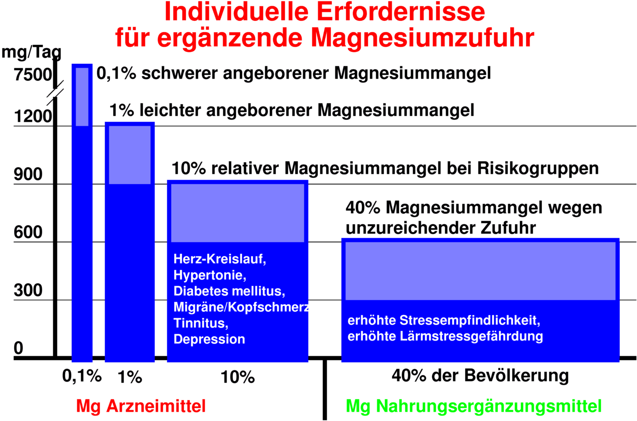 Der individuelle Bedarf muss berücksichtigt werden, weil er nachgewiesenermaßen stark schwankt und besonders bei Mangelpatienten erhöht ist. Die Genetik des Magnesiummangels muss beachtet werden (Weber und Konrad 2002).